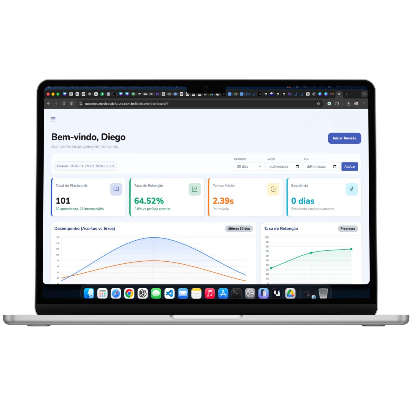 O dashboard atualiza conforme você estuda. Cada questão resolvida, cada simulado feito, cada flashcard revisado alimenta o painel. Você vê onde está errando mais e ajusta o foco antes que vire problema na prova.